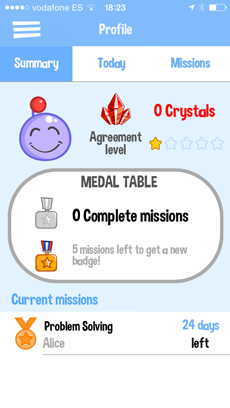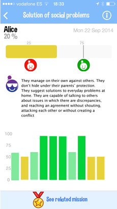 Once you have signed in, you will be able to access your children data in the different emotional areas. If any area stands out for being in a low level, we’ll show you the percentage sign in red and you will be able to see the missions you can carry out along with your child in order to improve such area.