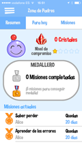 Una vez que estés registrado, podrás acceder a los datos de tus hijos en las diferentes áreas emocionales. Si alguna de las áreas destaca por tener un nivel bajo, te mostraremos el icono de porcentaje en rojo y podrás ver las misiones que puedes realizar con tu hijo para reforzar dicha área.